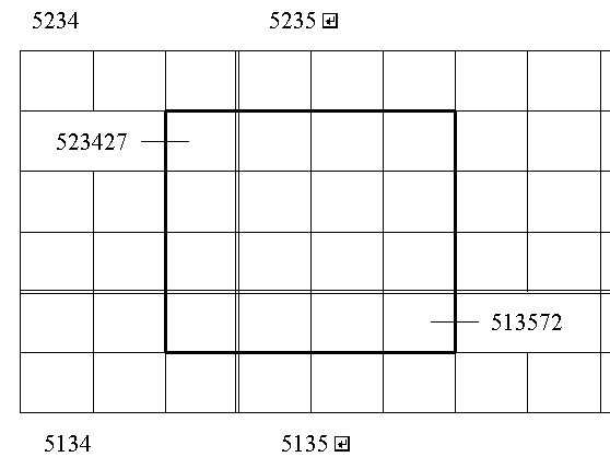 <図1>は神戸市内の地図作成のためのもので,でこれを例にして示したのが下の<図2>です.<図2>の細線のマス目は6桁のメッシュコードのマス目と考えてください.これはつまり一つが1:25,000の地図1枚に相当します.そして,太線がユーザーのつくろうと思っている地図の範囲と考えてください.二重線は4桁のメッシュコードの境界です.